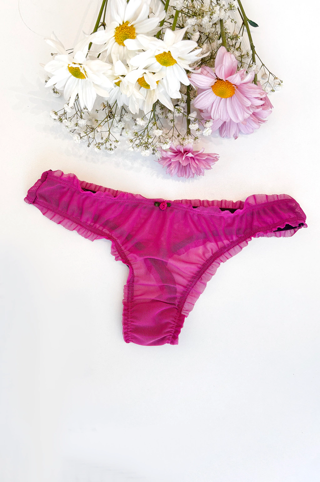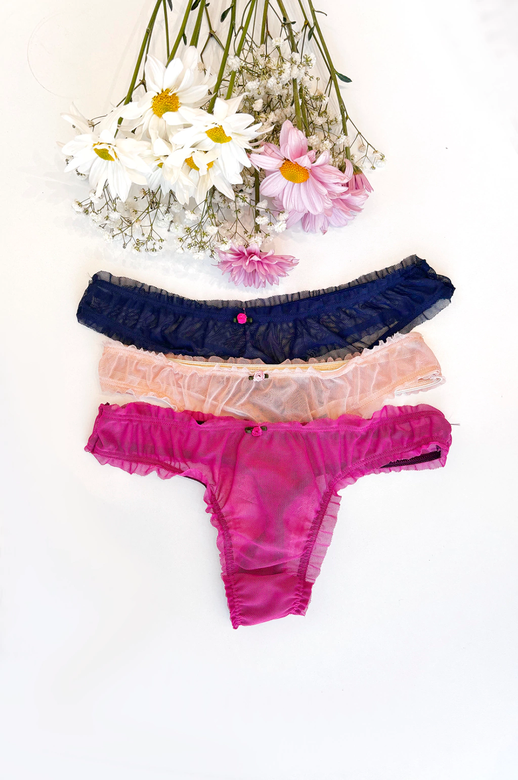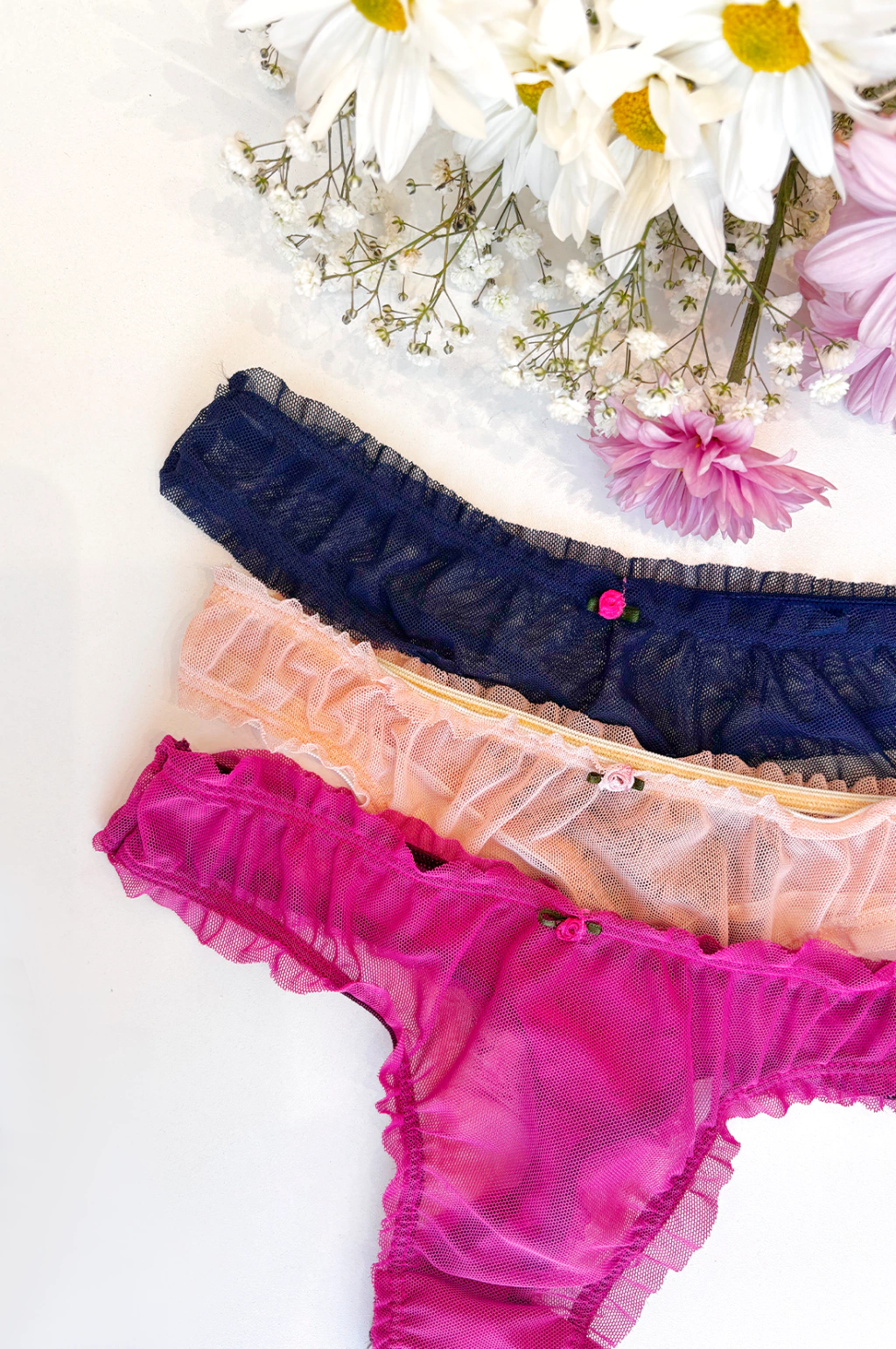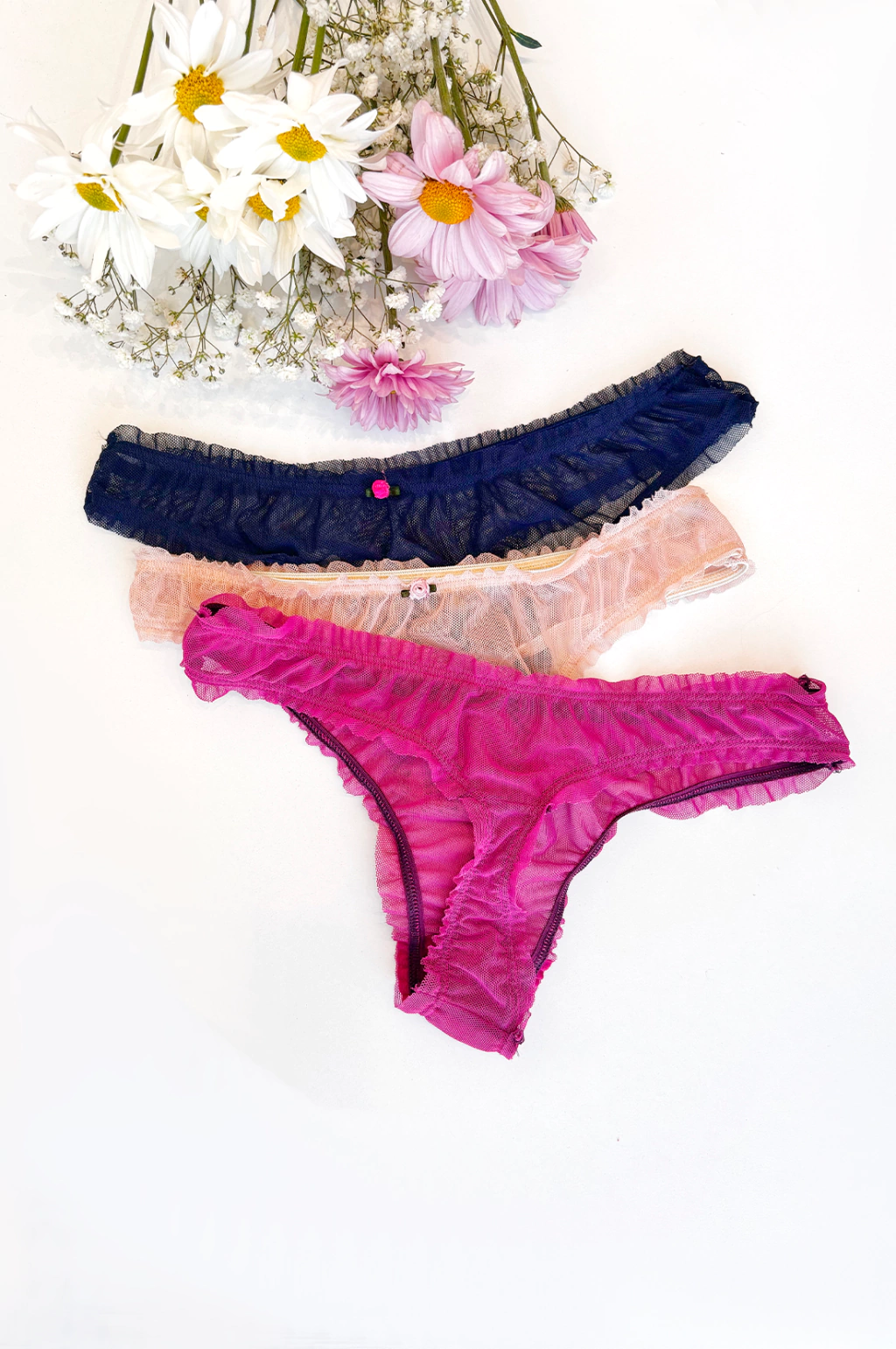 • Microtul liso • Estilo fru fru o repollito. No pierde los volados al estirarla • Tiene 1mts de elástico… ¡estiran un montón! • Algodón en zona íntima |